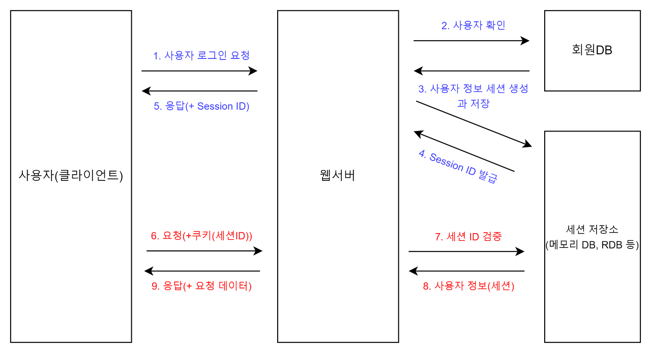 - 웹서버는 세션 id를 세션 저장소를 통해 세션을 검증한다.