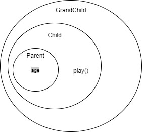 - GrandChild는 Child를 상속받기 때문에 Parent의 모든 멤버(age)와 Child의 모든 멤버(play)를 상속 받는다.