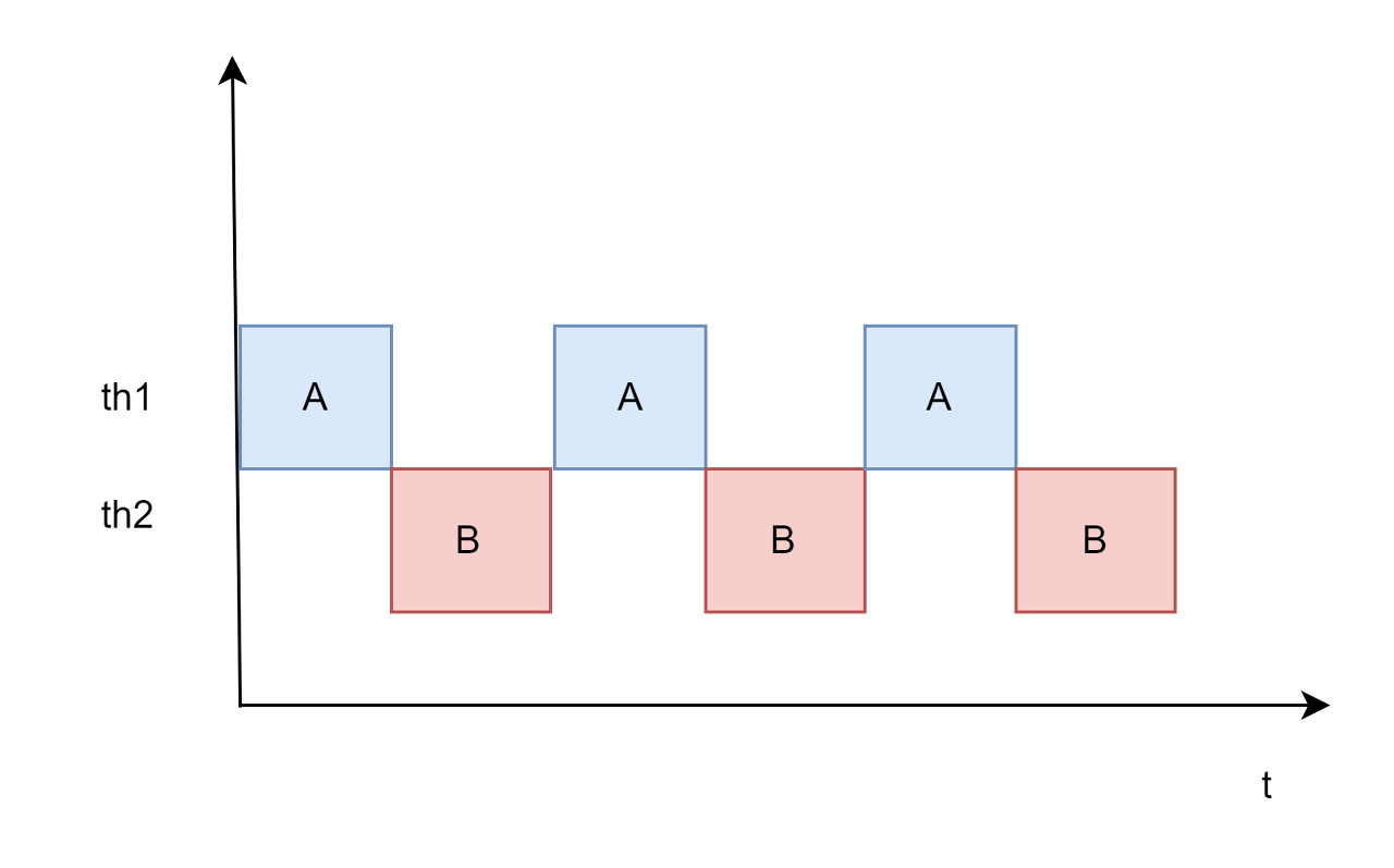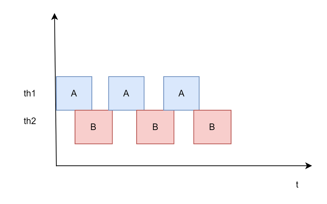 - 겹치는 부분이 발생하는 이유는 하나의 공유 리소스(console)에 대해 th1과 th2가 경쟁하기 때문이다.
