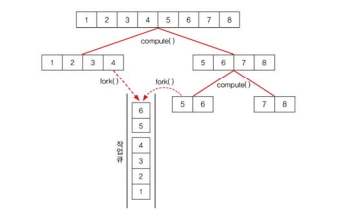 더할 숫자를 반으로 나눠서 한쪽에는 fork()를 호출해서 작업큐에 저장하고, 하나의 쓰레드는 compute()를 재귀호출 하면서 작업을 계속해서 반으로 나누고, 다른 쓰레드는 fork()에 의해 작업 큐에 추가된 작업을 수행한다.