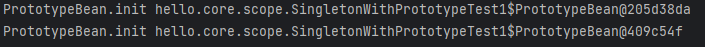 singletonBean2 = hello.core.scope.SingletonTest$SingletonBean@1cf56a1c