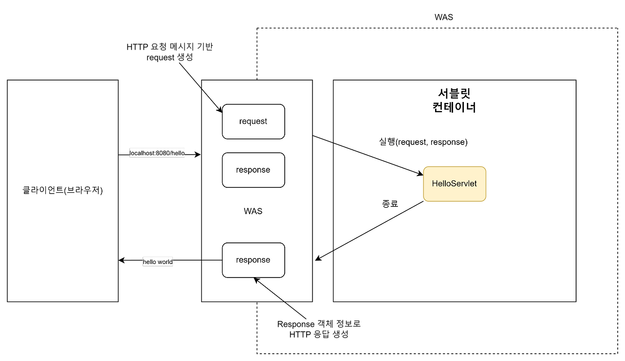 - WAS는 Request, Response 객체를 새로 만들어서 서블릿 객체 호출