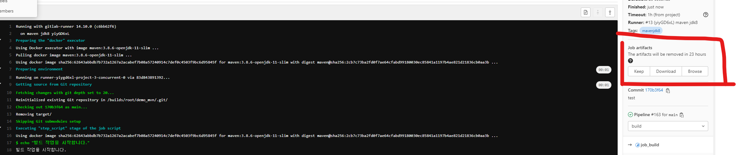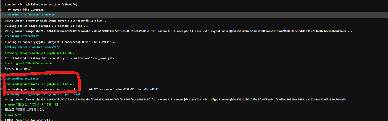 - 로그를 보면 build에서 수행된 결과물인 artifacts로 저장된 파일들을 test jop을 수행하는 runner에서 자동으로 다운로드 한다.