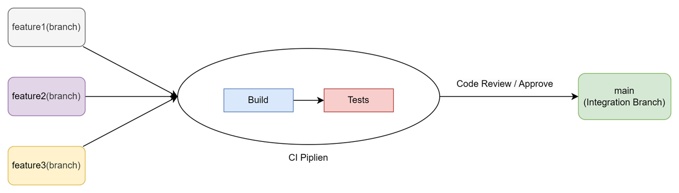 원격 저장소에 공용으로 사용하는 Repository를 생성하고, 각 개인은 브랜치를 생성하여 작업한다. 이를 통해 여러 개발자가 병렬적으로 작업할 수 있으며, 작업한 코드는 충분한 테스트와 코드리뷰를 통해 통합브랜치(예: main)에 merge 하여 소스코드를 통합한다.