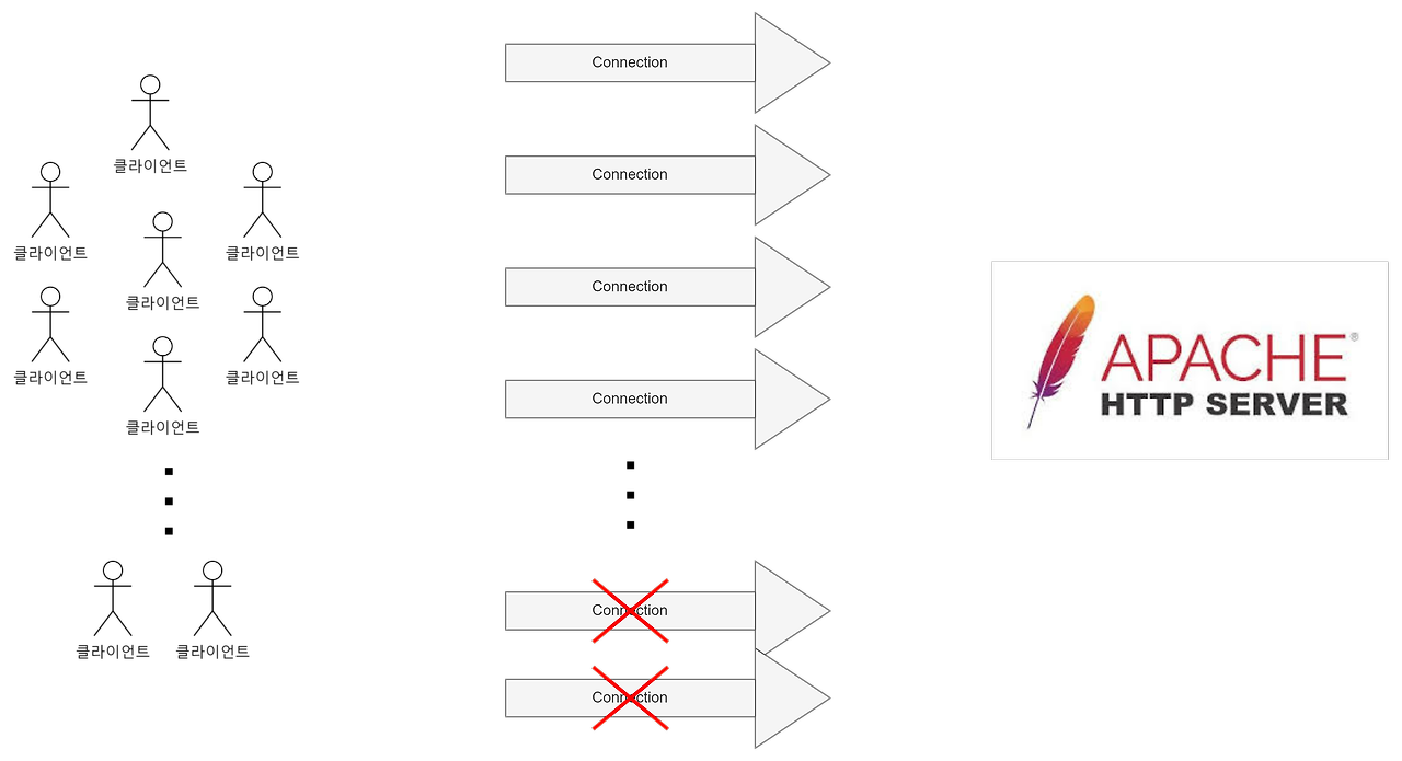 매 요청마다 새로운 프로세스를 생성하므로, 메모리 사용량이 증가로 인해 새로운 연결을 처리하지 못하는 문제가 발생했다. => C10K(Connection 10000 Problem)
