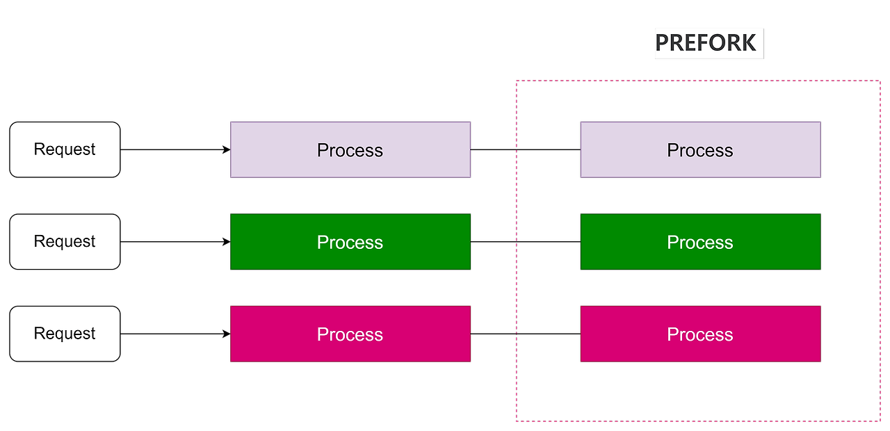 요청을 처리하기 위해 요청마다 프로세스를 생성하면 그에 따른 비용이 발생한다. PREFORK라는 방식을 사용하여 미리 프로세스를 만들어놓고, 요청이 들어오면 프로세스를 할당하는 방식으로 동작한다. 쉬고 있는 프로세스가 없을 경우에 프로세스를 새로 생성해서 요청을 처리하는 방식이다.